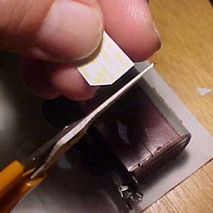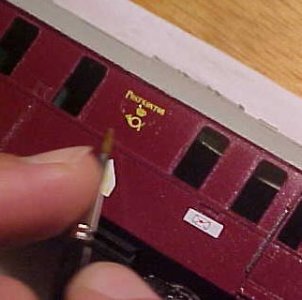 Hold bagpapiret med pincetten ned mod modellen og hold mærket fast mod modellen med en pensel eller tandstikker eller andet der ikke ridser mærket. Træk bagpapiret forsigtigt væk under mærket. Pas på med knappenåle uden en holder, de smutter af og til med ridser som resultat. I stedet for Micro Set kan man også bruge lidt vand på modellen, hvis mærket skal svømmes på plads. Sug noget af vandet væk med en spids strimmel køkkenrulle, og hvis mærket lægger sig pænt ned i brædderiller eller hen over stolper, kan man suge resten væk. Skal der rettes op på noget skal det gøres nu, da limen begynder at virke når vandet suges væk. Dup lidt vand langs kanten af mærket, (brug evt. en plasticpipette - kan fås i velassorterede hobbybutikker) og flyt det på plads. For megen retten op kan gøre limen noget tynd og mærket begynder at krølle op ret let, når det sker. Sørg for ordentlig belysning og mulighed for god understøtning af hænderne når du arbejder, så går det også nemmere med påsætningen.